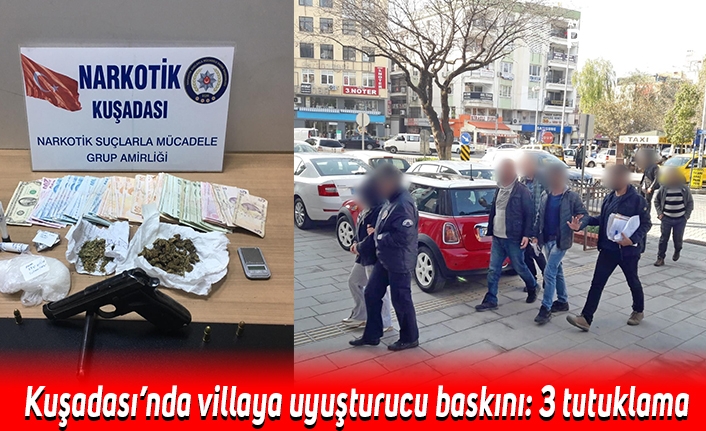 Kuşadası’nda polisin bir villaya gerçekleştirdiği uyuşturucu baskınında gözaltına alınan biri bayan 3 kişi tutuklandı. Baskında çok miktarda uyuşturucu madde ile ruhsatsız bir silah ele geçirildi.