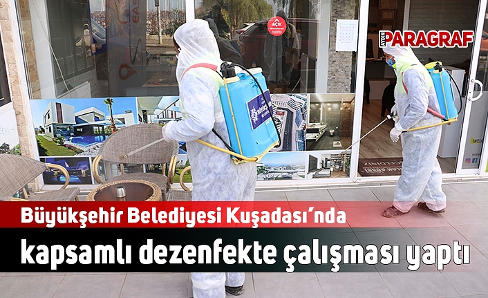 Büyükşehir ekipleri Kuşadası’nda kapsamlı bir dezenfeksiyon çalışması yaptı. Çevre Koruma ve Kontrol Dairesi’ne bağlı mobil ekipler, toplu kullanım alanlarında olan dükkanları, taksi durakları ile park ve sahil şeridindeki bankları dezenfekte etti. Cadde ve yollarda ise hijyen araçları çalışma yaptı.