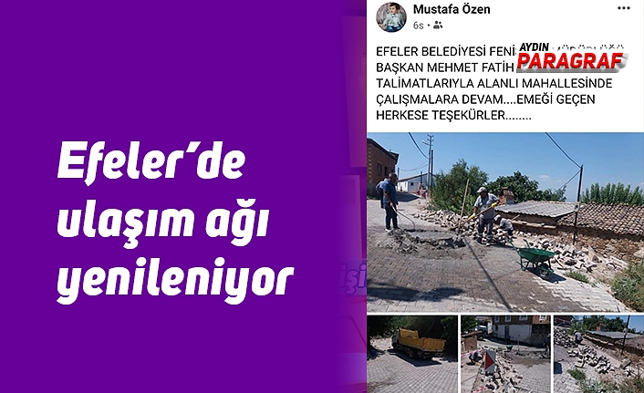 Efeler Belediyesi ekiplerinin yoğun emek sarf ederek gerçekleştirdikleri çalışmalara Alanlı Mahallesi Muhtarı Mustafa Özen kayıtsız kalmadı. Özen, sosyal medya hesabında yol çalışmaları esnasında çekilmiş fotoğrafları paylaşarak “Efeler Belediyesi Fen İşleri Müdürlüğü, Başkan Mehmet Fatih Atay’ın talimatlarıyla Alanlı Mahallesi’nde çalışmalara devam ediyor… Emeği geçen herkese teşekkürler…” ifadelerine yer verdi.