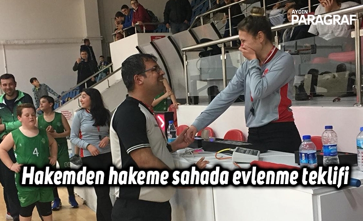 Aydın’da, oynanan basketbol maçının durmasını fırsat bilerek hakem masasına gelen başhakem Ahmet Ala, hakem kız arkadaşı Pelin Çelik’e sürpriz bir evlilik teklifi yaptı.