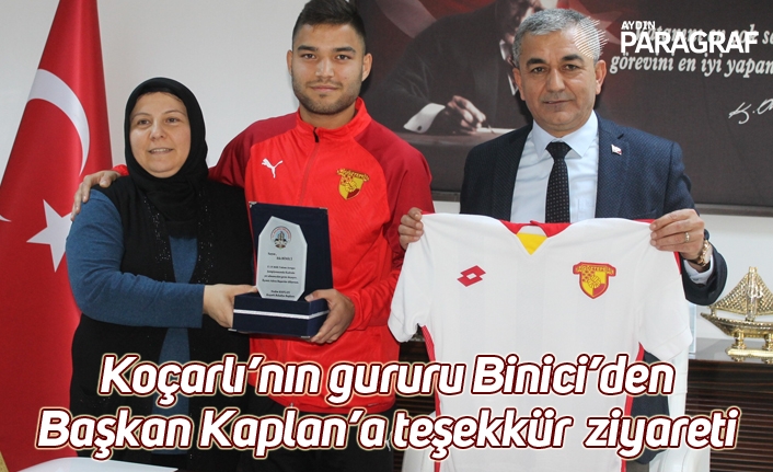 Koçarlı’nın Türk futboluna armağan ettiği yetenekli futbolculardan biri olan Efe Binici, Koçarlı Belediye Başkanı Nedim Kaplan’ı makamında ziyaret etti.