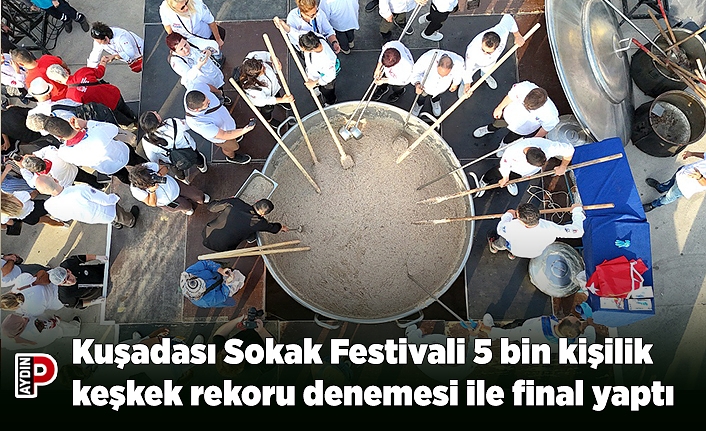 Uluslararası Kuşadası Sokak Festivali, dev kazanda pişirilen 5 bin kişilik 3 ton keşkek ile bir rekor denemesine imza attı. 600 kilo buğday, 600 kilo dana eti, 200 kilo tereyağı ve 1,5 ton su kullanılarak hazırlanan keşkek davul, zurna ve zeybek gösterisi eşliğinde halka ikram edildi.